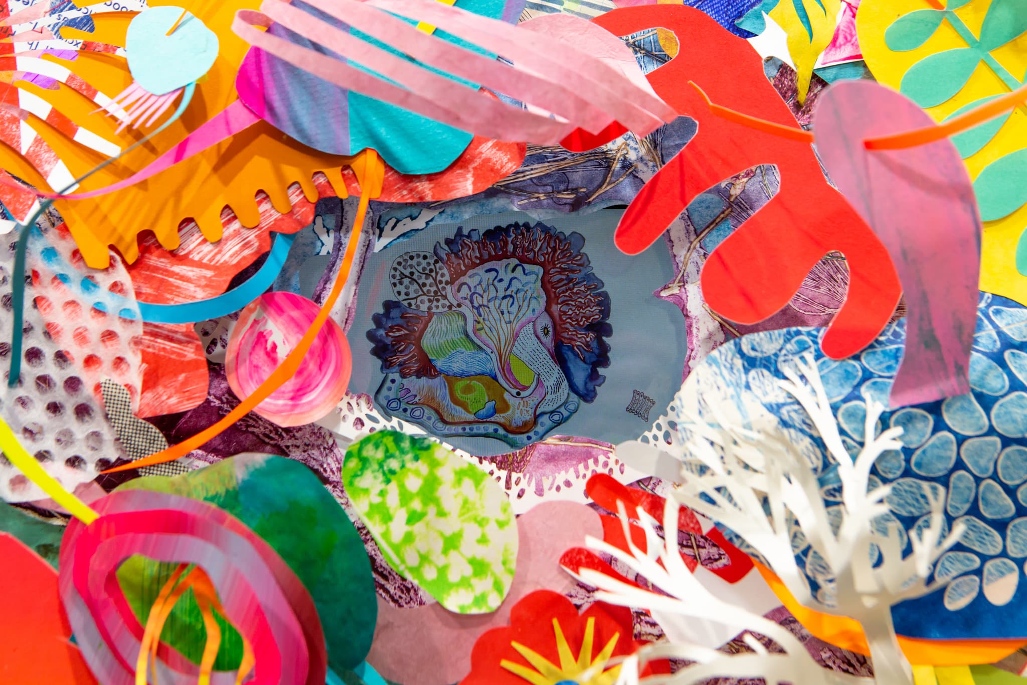 “I’ve been trying to keep away from purely digital work,” Erdelyi notes. “Partly I think it’s just because I have this background with craft and working with my hands and touching things, so I consider the work I’m doing a hybrid animation process. It’s analog and digital combined.” That’s also true of her second work in the exhibit, a new wall piece called Ma Femme Maison (2019) that presents two exuberant collages connected by a hot-pink umbilical cord. These riotous forms arise from found papers and monoprint scraps that have been carefully cut like lace, bored with holes like Swiss cheese, or fashioned into orbs, organs, feathers, and flowers. Most of the colors are neon-bright hues hard to find in nature, but the shapes are organic, by turns botanical, aquatic, anatomical, cosmic. Each wild yet delicate assemblage surrounds a small LED screen that plays looping animations inspired by nineteenth-century drawings of developing embryos.