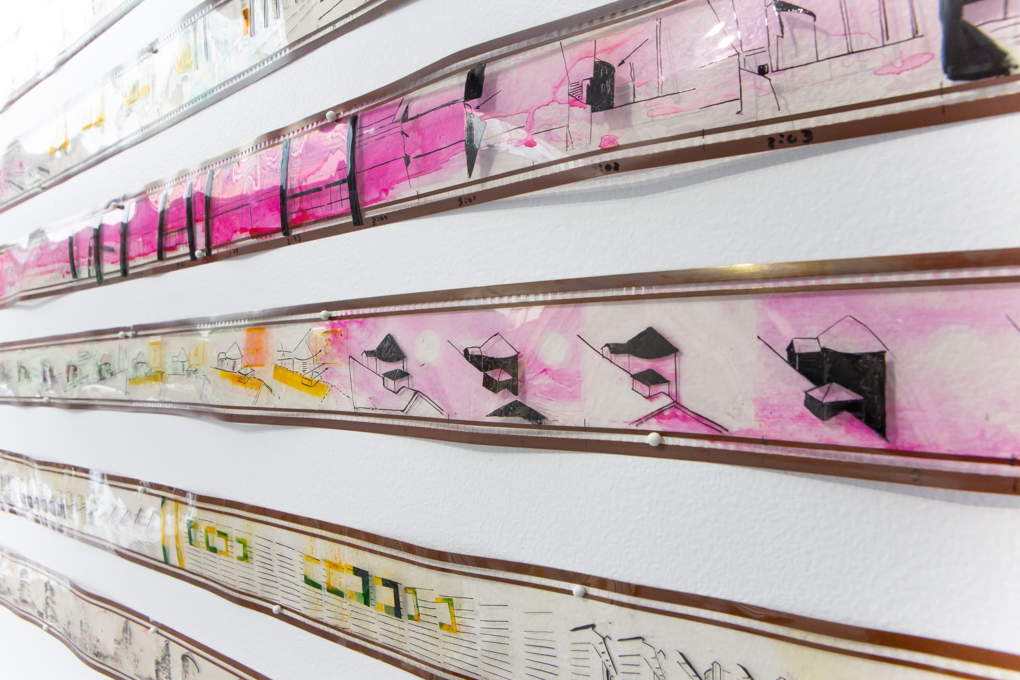 Several of the exhibit’s thirteen artists and art collectives share both process and final product in this way, showing film strips or individual cells alongside the resulting animations. Other artists present work without any screens at all. Putting a modern spin on zoetrope, Eric Dyer’s strobe-lit sculpture Eadweard’s Menagerie (2017) recontextualizes nineteenth-century photographer Eadweard Muybridge’s sequences of nude women cavorting for the camera, setting them in motion under the gaze of a giant nude Muybridge. From afar, Amy Lee Ketchum’s Polaroids (2016–2018) appears to be a grid of one hundred snapshots, but closer inspection reveals the impromptu still-lifes and candid portraits to be anything but instant: each is a memory carved from cardboard, a material she uses in animation. And Alexandra Borovski and Tyler Giordano created sculptural furniture—including Cappy (2019), a giant cartoony caterpillar in vinyl and faux fur—that visitors can lounge on while viewing the films.