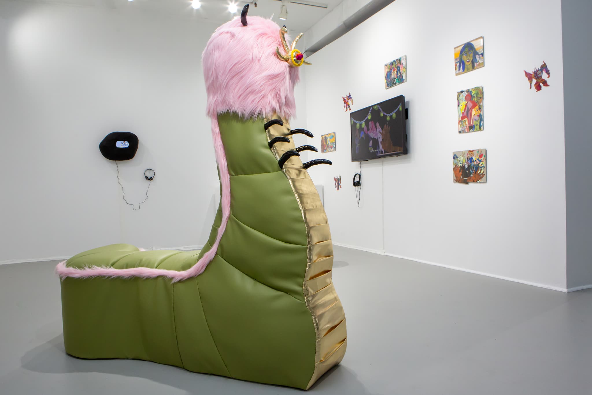 Center: Tarakhan (Alexandra Borovski and Tyler Giordano), Cappy, 2019. Left: Ashley Wick, We are having a personal experience, 2015. Right: Laura Harrison, Little Red Giant, the Monster That I Was, 2017 and related works on paper. Installation view, The Skin Has Eyes, Mills Gallery, Boston Center for the Arts, 2019. Photo by Melissa Blackall.