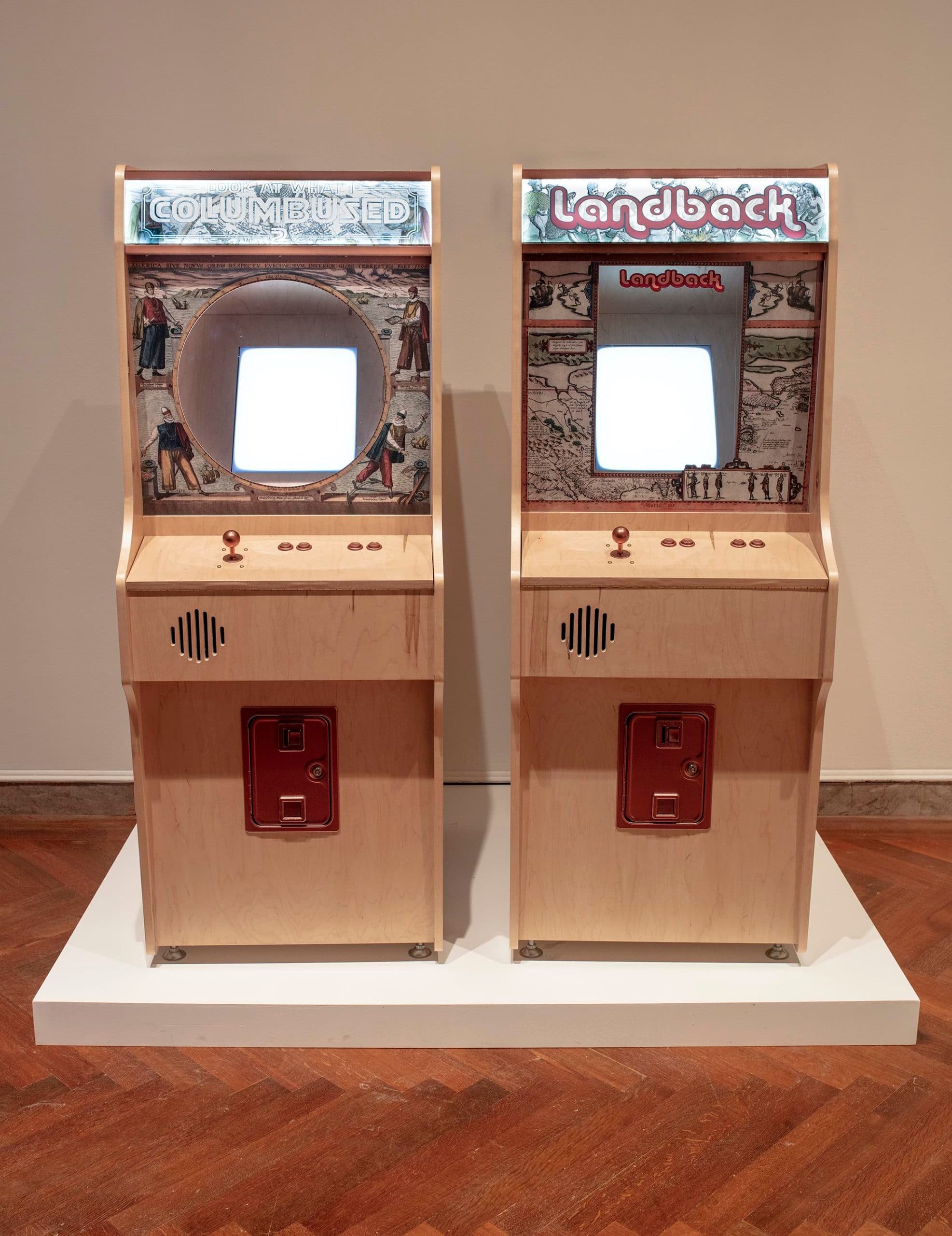 Sonny Assu, Look at What I Columbused 2 and Landback from Insert Coin, 2020. Arcade cabinets (maple plywood, screen, electronic components), copper paint, Mylar, adhesive vinyl, and 10-second video loop © Sonny Assu. Courtesy of the artist and Equinox Gallery.