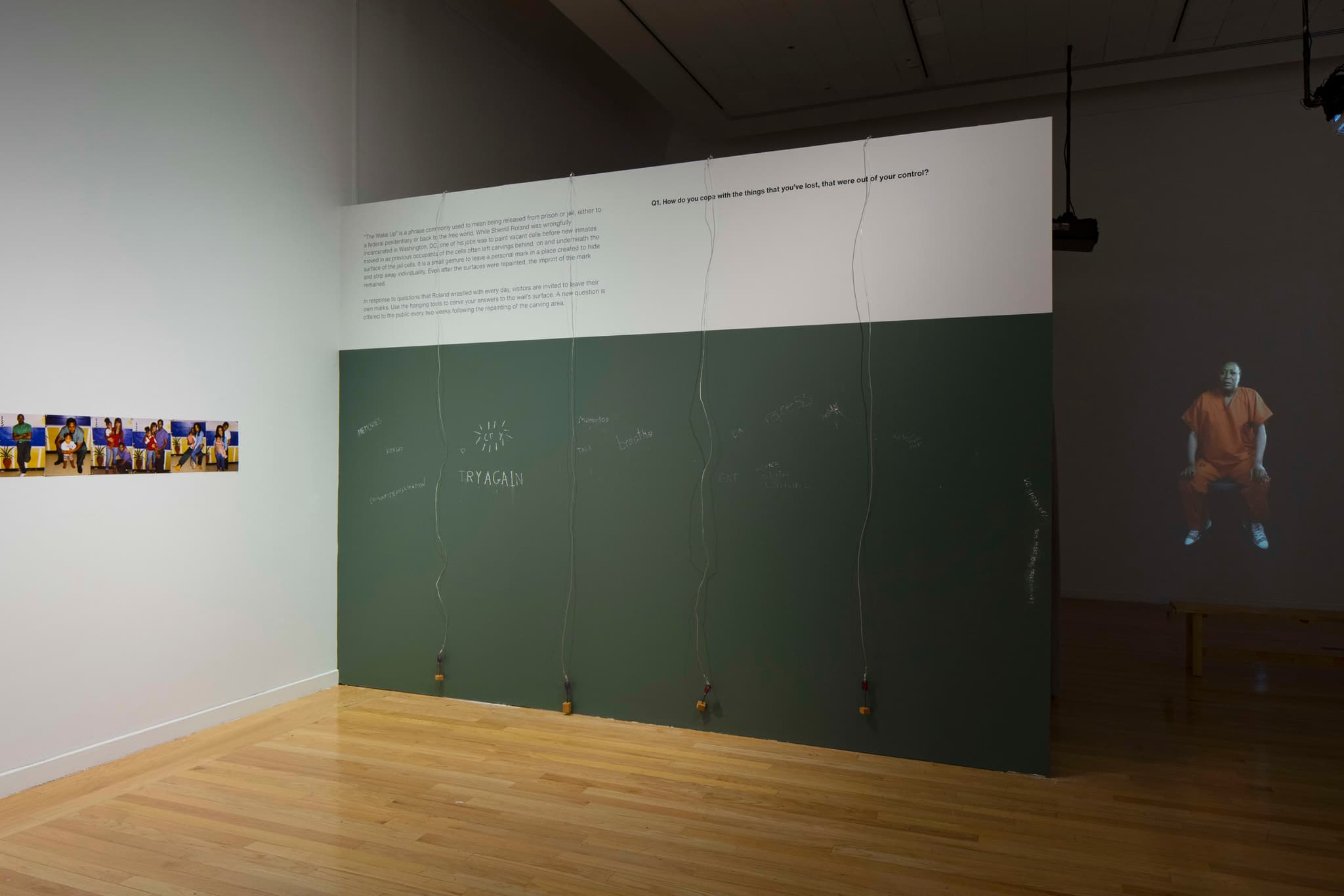 Just beyond Gaspar’s installation is an interactive wall by Sherrill Roland, “The Jumpsuit Project,” where visitors are invited to chisel words into a wall that is periodically painted over during the course of the exhibition using tools similar to what might be found inside a prison. This installation contributes in a direct manner to the Incarceration theme—where time is examined through the lens of a prisoner or their family. Here, Roland reflects upon his experience as a prisoner when he was jailed for a crime he did not commit. He, with a team, prepared recently vacated cells for their next inhabitants by painting walls that were not prepped or cleaned. Traces inevitably showed through the fresh paint, and the many layers provided ready means for further mark-making.