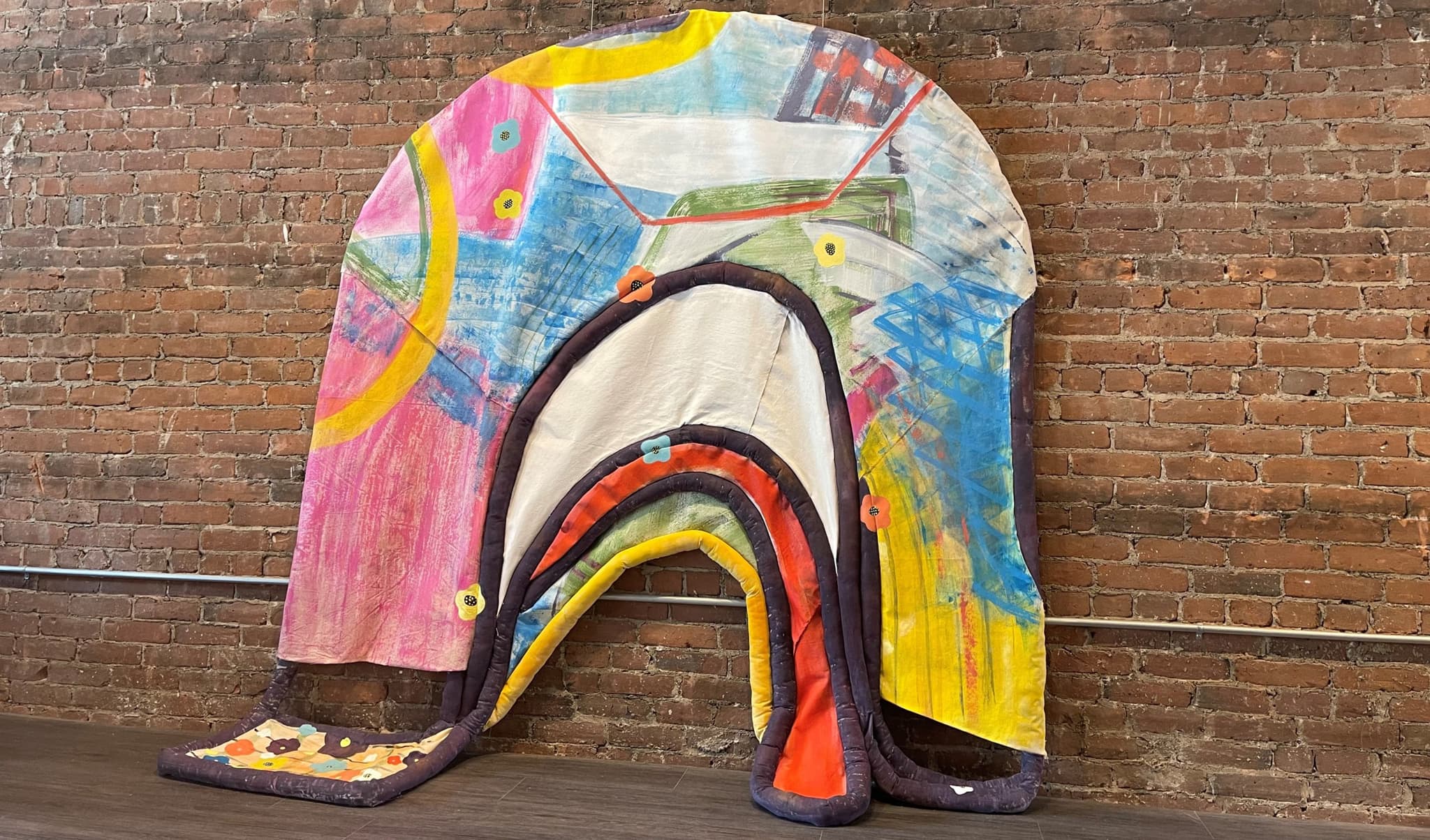 As a lifelong artist and Arlington resident, Arch is known for her larger-than-life sculptures that are sometimes wall-based and sometimes airborne. Inspired by fashion, playground structures, and theater sets, Arch conjures a whimsical, Seuss-like spirit into a three-dimensional atmosphere. The artist was lined up for a solo show at Nearby when she realized she wanted to share the gallery with a painter. She found Hart, who moved to Boston recently, on Instagram and was “intrigued by her original approach to painting.” After studio visits, the artists decided to place their work into a dialogue.