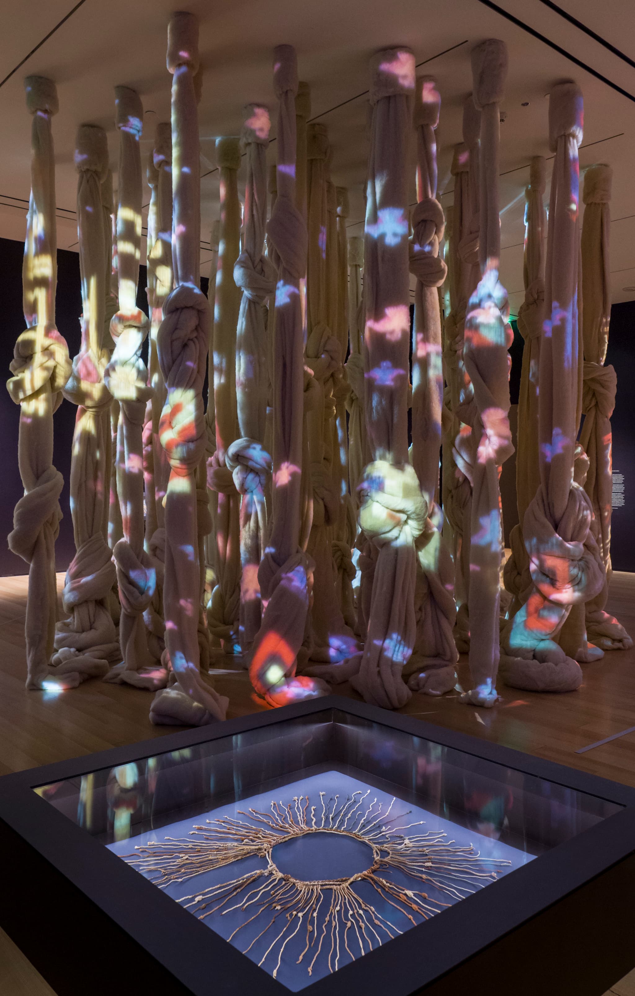 JJ: And in this exhibition at the MFA, your contemporary quipu is actually being displayed in conjunction with ancient quipus from the Incan and Andean civilizations. Presented together, that time-transcending conversation begins to emerge right here in the museum setting. How has the inclusion of these artifacts shaped your approach to creating this installation?