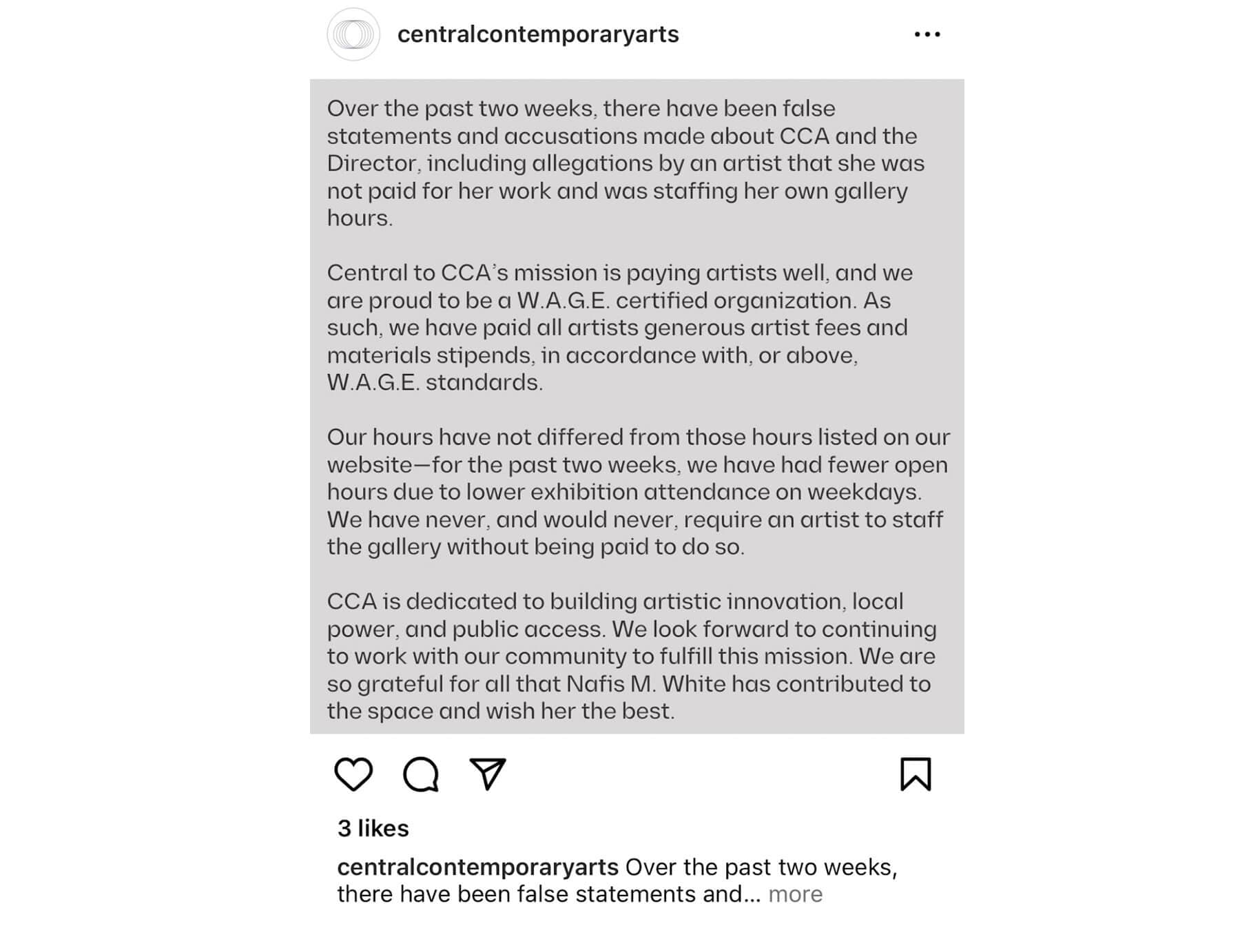 As I write this article, the statement has been removed from Instagram and the CCA account has been deactivated. Before it was removed, the statement had about sixty comments critiquing the language as dodging accountability and avoiding the larger concerns and allegations made by the artist. One commenter, Arielle Jennings (@arimjenn), wrote: “You may have compensated Nafis in some form or fashion, but you are directly interfering with her receiving additional opportunities, connections, and sales of her artwork by changing the hours of the gallery last minute and not allowing the community to see her work.” Notably, W.A.G.E. responded from their official Instagram account (@wageforwork), sharing, “Yes, CCA is W.A.G.E. Certified but to be totally clear, W.A.G.E. Certification is limited to paying artists equitably. Using it to paper over or justify questionable institutional practices outside of that scope is W.A.G.E. Washing.”