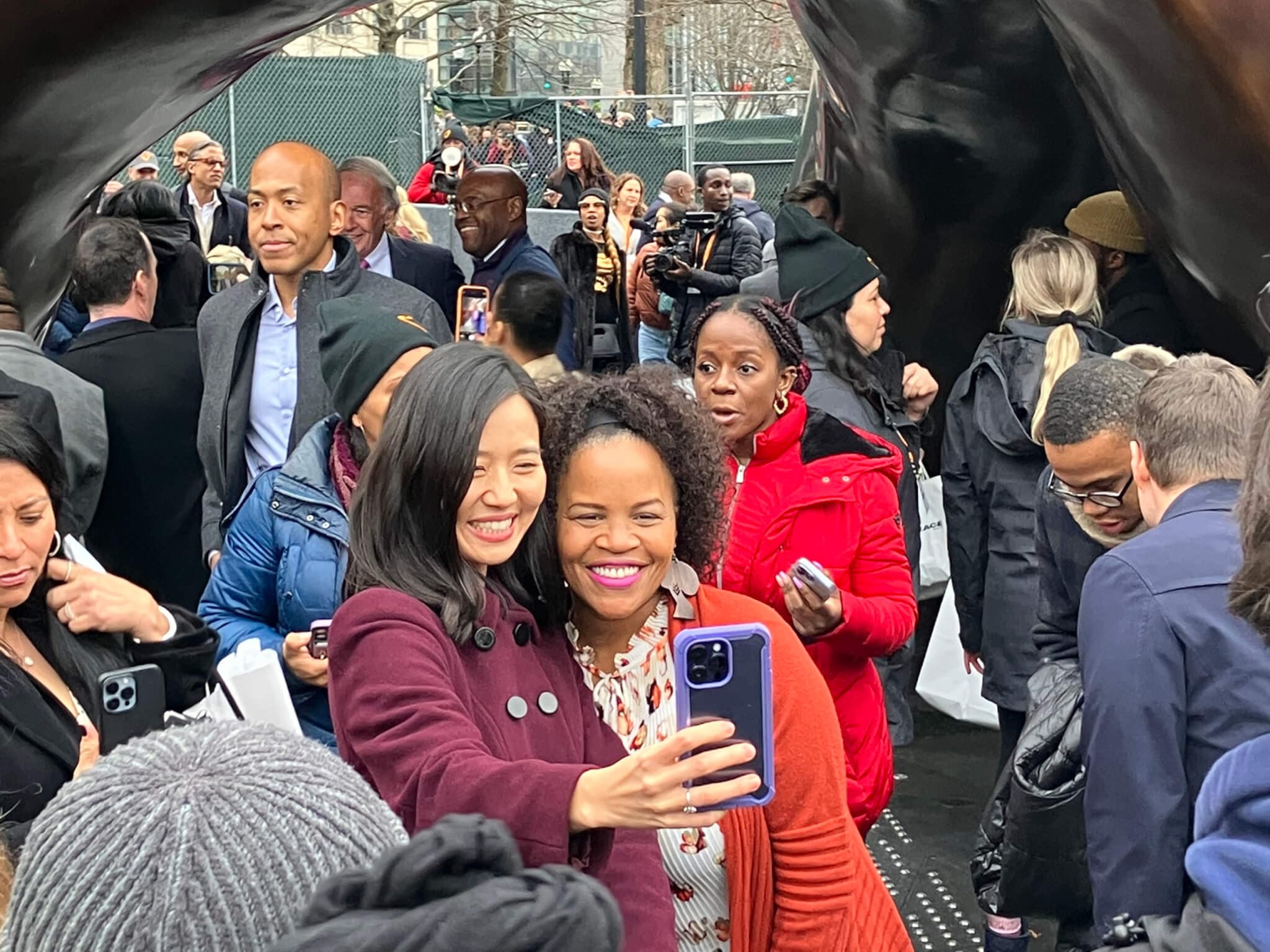 Mayor Michelle Wu and her predecessor Kim Janey grab a selfie shortly after the unveiling of The Embrace. Photo by Boston Art Review.