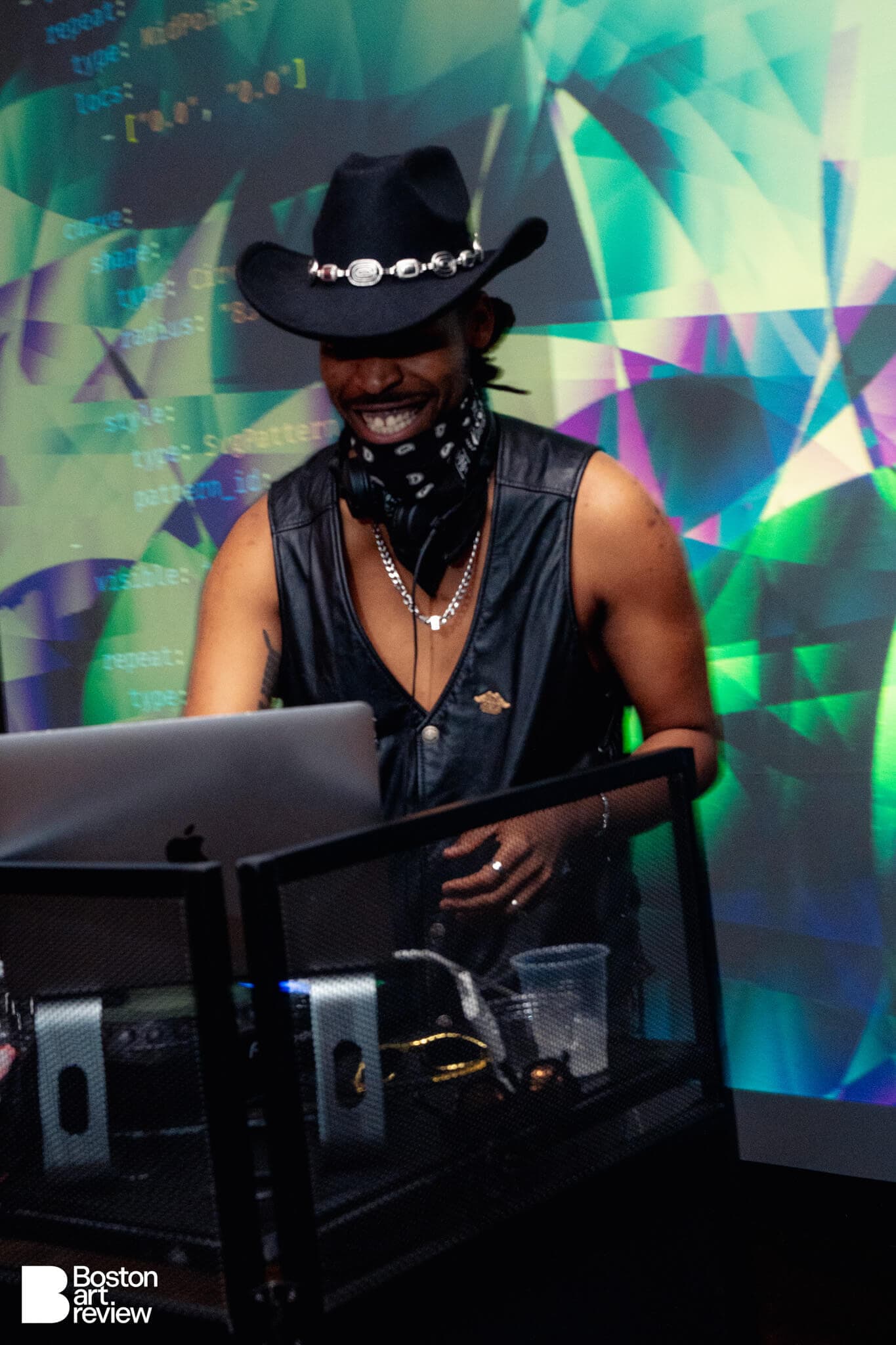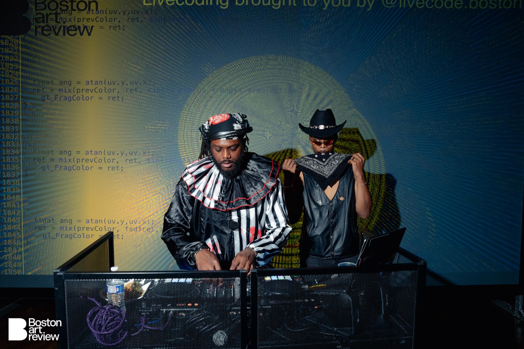 During the party, there were live coding video performances by Boston Tech Poetics (Char Stiles, Jessica Stringham, Blktrmlne, Shawn Toubeau, and Jame Coyne.) Exhibited works by Allison Tanenhaus, Supreetha K, and Rasita Kartarharja adorned the room while lighting by Jim Manning lit up the dance floor.