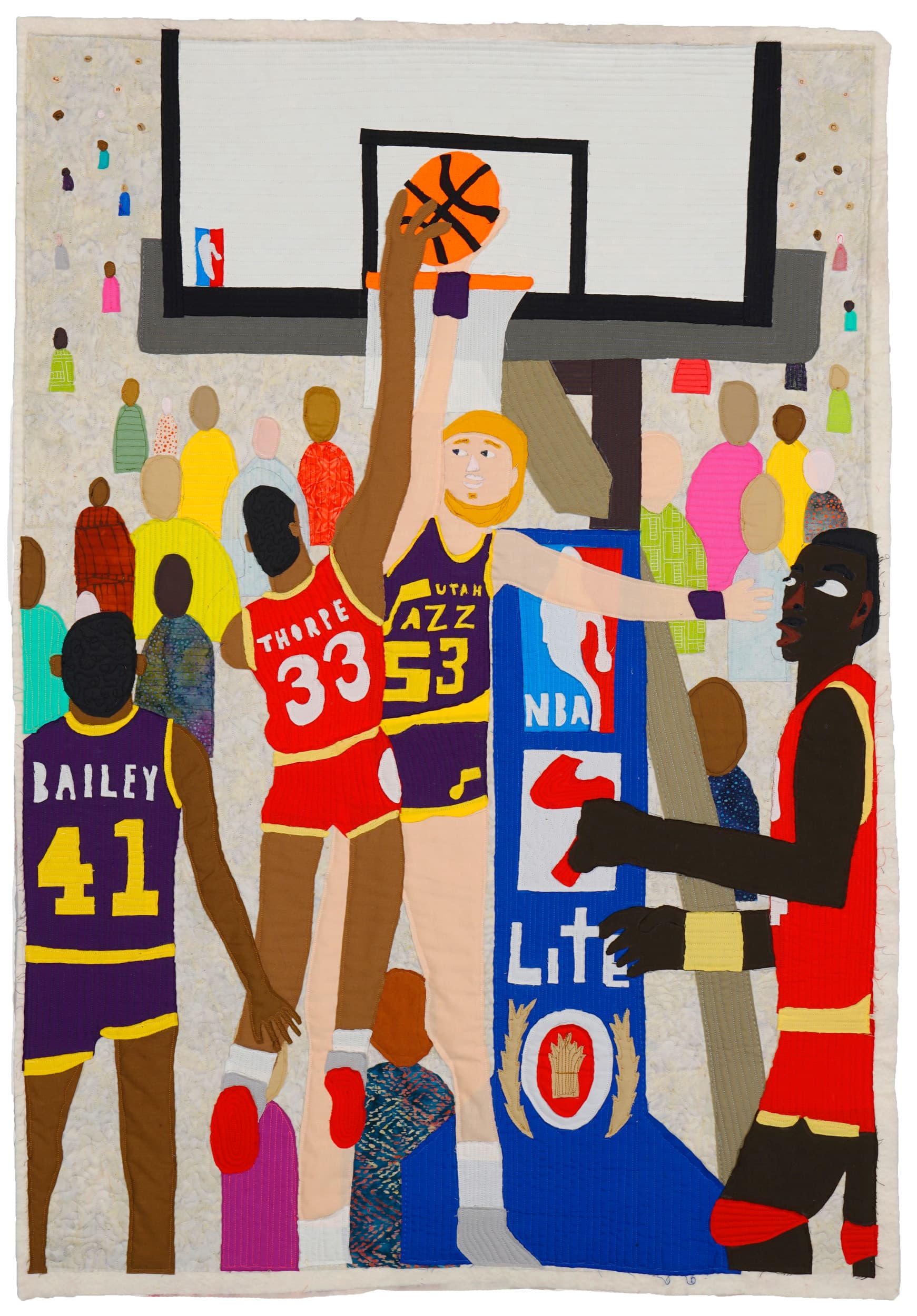 Thorpe, who spent most of his life on the trajectory of being a basketball star, was surrounded by quilting from a young age. His mom filled their home with her own creations, while his aunt owned a small quilting shop in southern New Hampshire. It wasn’t until Thorpe graduated from Emerson College and left his basketball days behind that he finally picked up the knack for quilting too. Yet his approach was anything but the cut-and-shape conventions that preceded him. For Thorpe, the quilt has become a canvas for dreaming up alternate pasts and exploring potential futures.