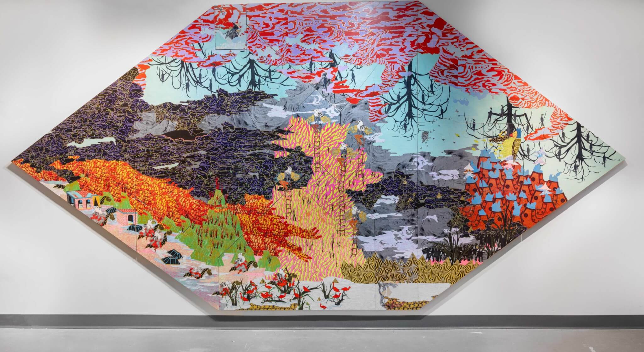 Though references to gender, race, and immigration are visible in the imagery  of her early works, Hong remarks that it is relatively recently that she’s self-consciously re-examining her processes through these now more prevalent discourses. One of the major themes that is woven through each work, perceived newly through these lenses, is physical labor. Hong notes that she worked in the puzzle-like format of Setting Sun so that she could make monumental pieces while still being able to fit them in her car. As a young woman artist, she very much felt she had to be able to take care of everything herself.