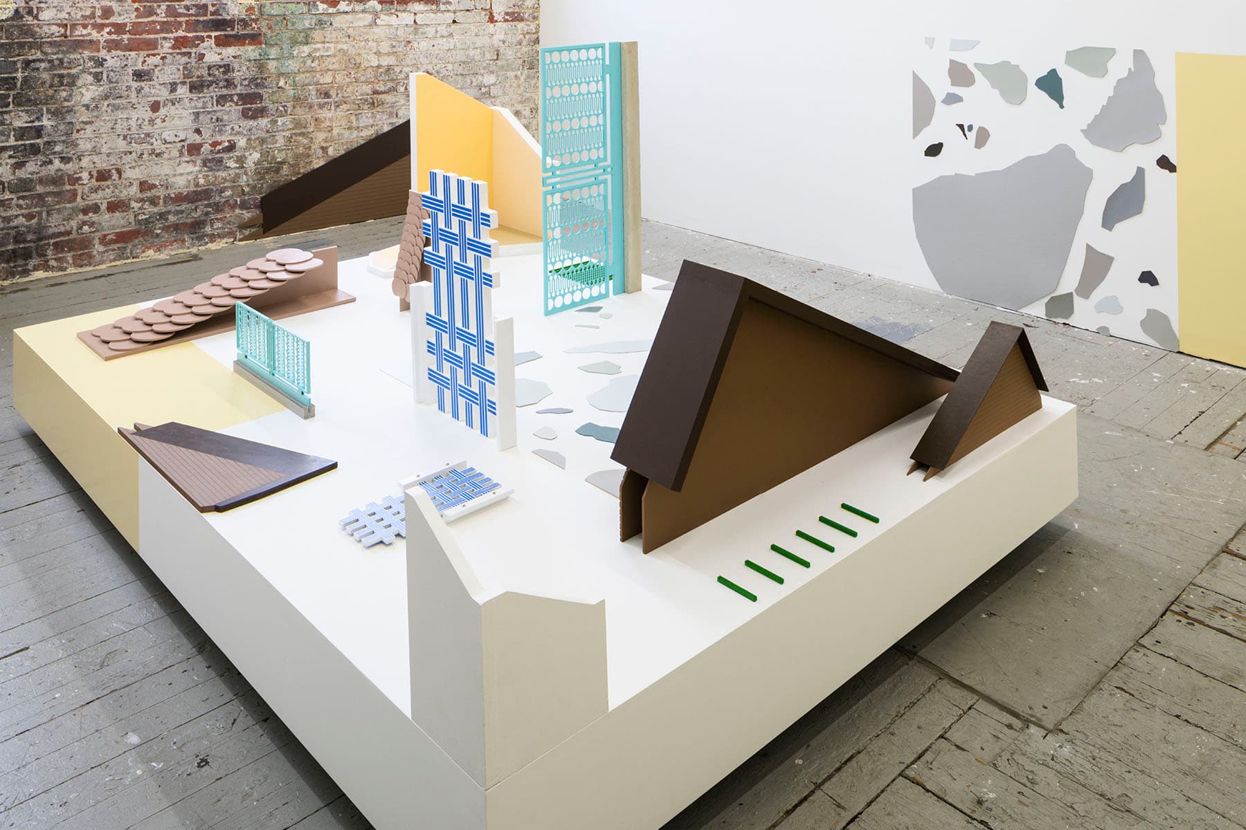Katarina Burin and Farhad Mirza, "a low storey between two others," 2019. Columns, corners, roofs, floors, chairs, gates, grasses, stairs mdf, paper, chipboard, paint, wood, concrete, screws. Image courtesy of the artists and Anthony Greaney.