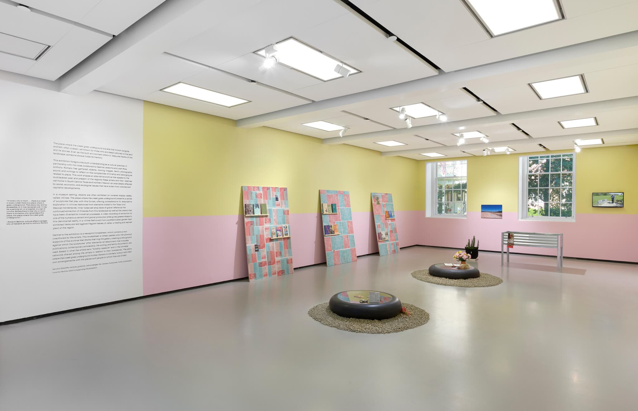 Place as Practice Research Collective, "The place where the creek goes underground," installation view, on view in the Johnson-Kulukundis Family Gallery, Harvard Radcliffe Institute, through December 14, 2024. Photo by Julia Featheringill. Courtesy of the artists and Harvard Radcliffe Institute.